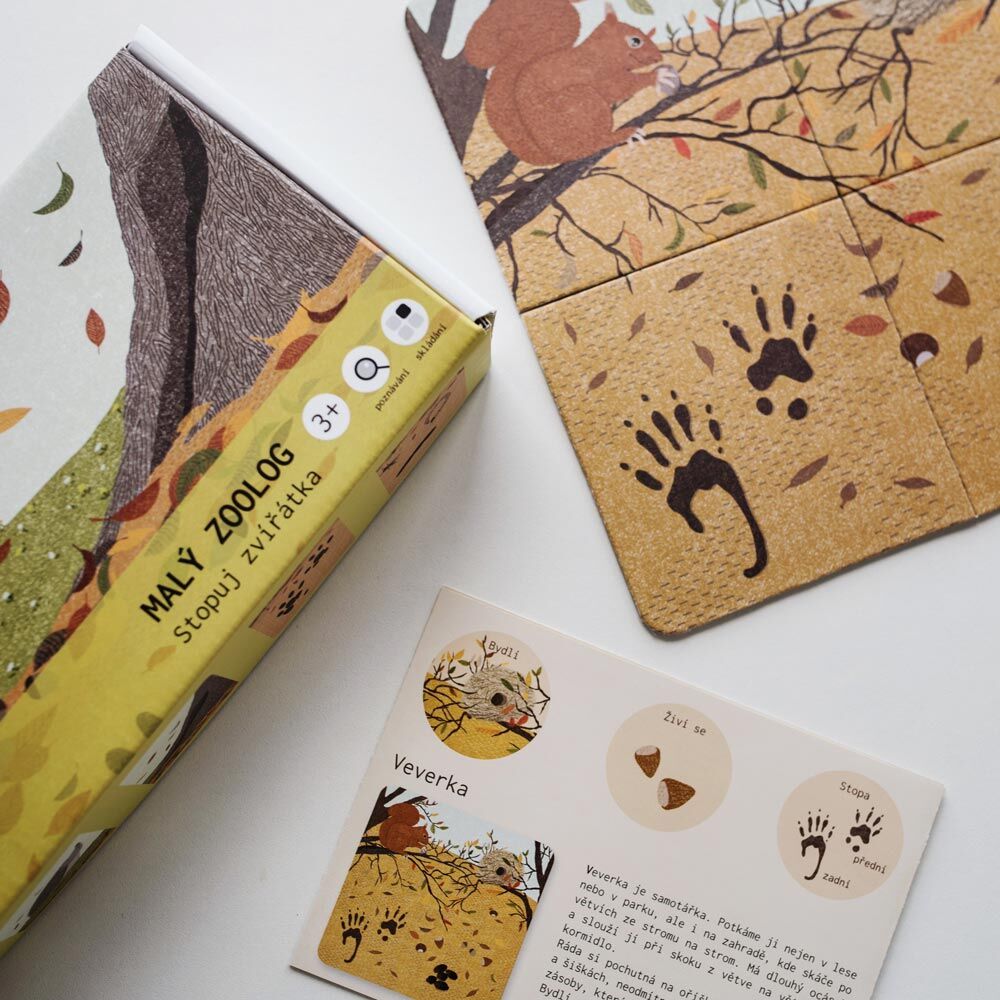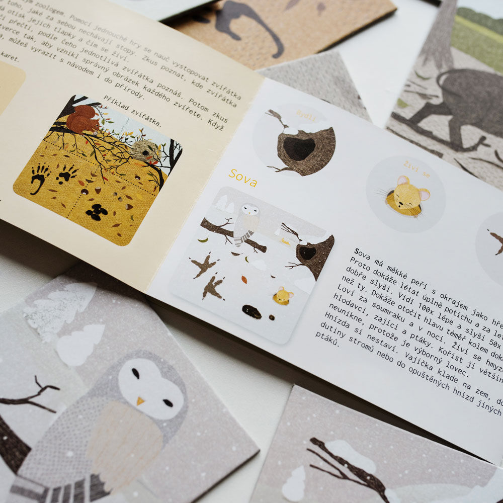 V krabičce je 24 kašírovaných kartiček (6 zvířat: ježek, králík, divočák, veverka, sova, medvěd) a manuál. Pro děti od 3 let.
