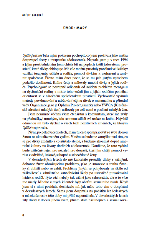 Při svém prvním vydání v angličtině v roce 1994 obrátila kniha Ofélie podruhé tolik potřebnou pozornost na problémy, kterým musí čelit dospívající dívky.