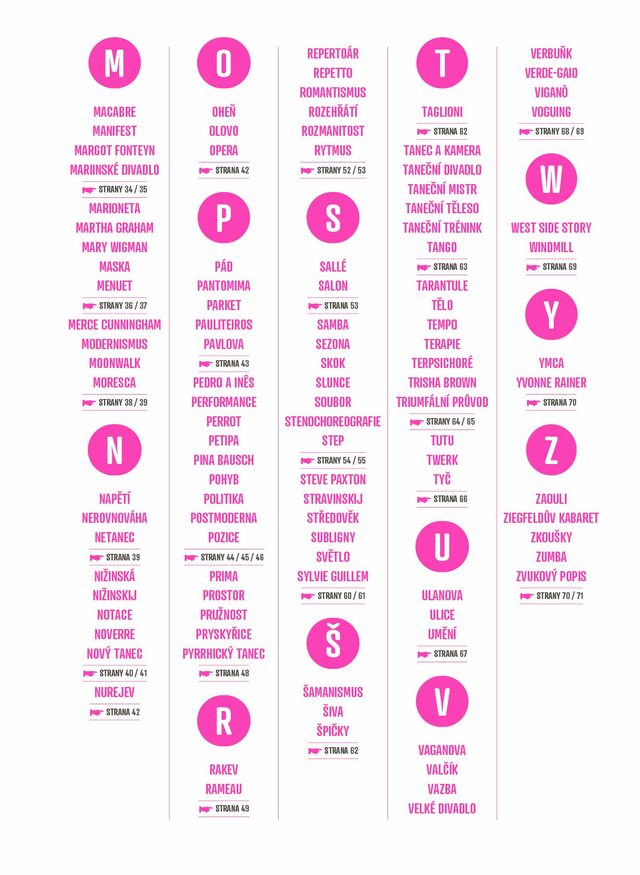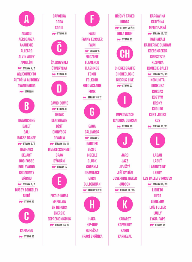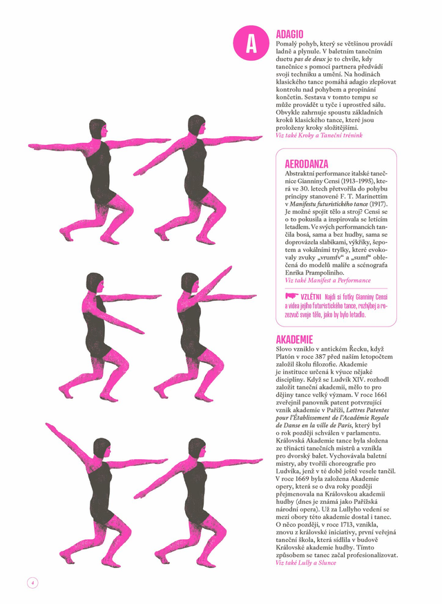 Kniha obsahuje abecedně řazená hesla, která seznamují s jednotlivými tanci, styly, osobnostmi, zvyky, historickými okamžiky a mnoha dalšími informacemi ze světa tance. Motivuje k pohybu prostřednictvím drobných úkolů.