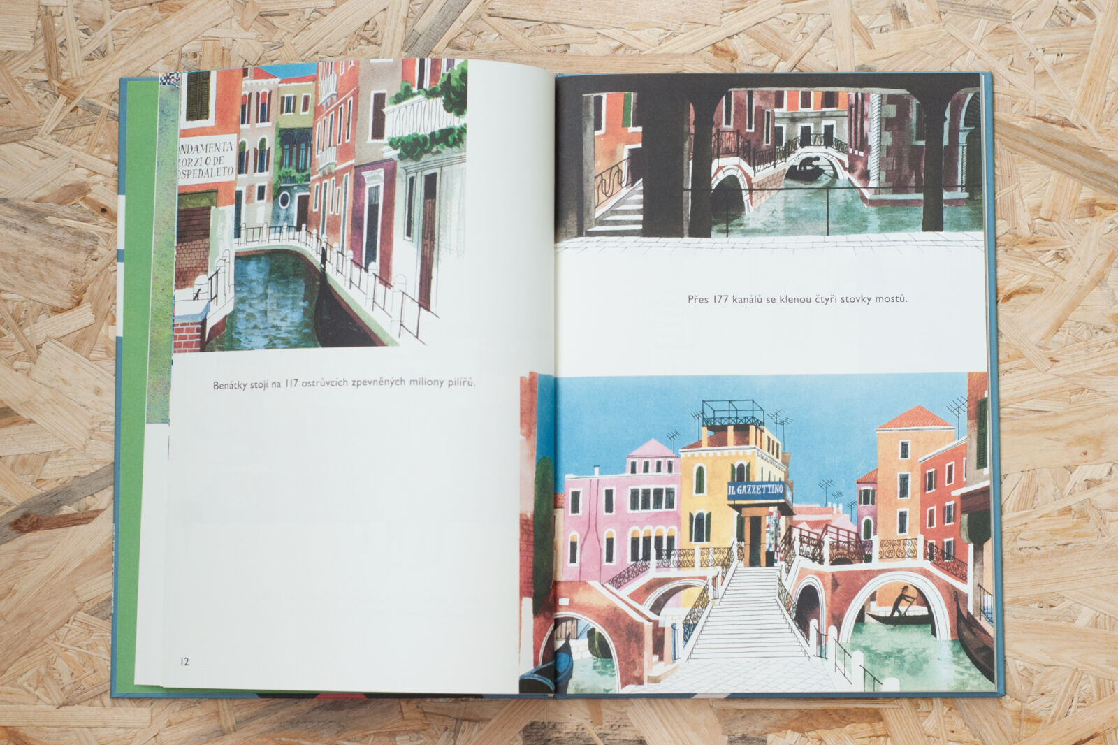 Město, kde místo hlavní třídy mají kanál a po vodě jezdí i metaři a autobusy se zvláštními šplouchavými jmény: vaporetto, motoscafo… To jsou přeci Benátky! Po Paříži, Londýnu, Římu nás Miroslav Šašek přivádí do jedinečného města na vodě. Pozorným okem a jemným štětcem zachytil paláce, gondoly, mosty i holuby. Čtenářům ukazuje, jak Benátky vypadaly před padesáti lety i stovky let předtím… a jak i vypadat budou, dokud moře nerozhodne jinak.
