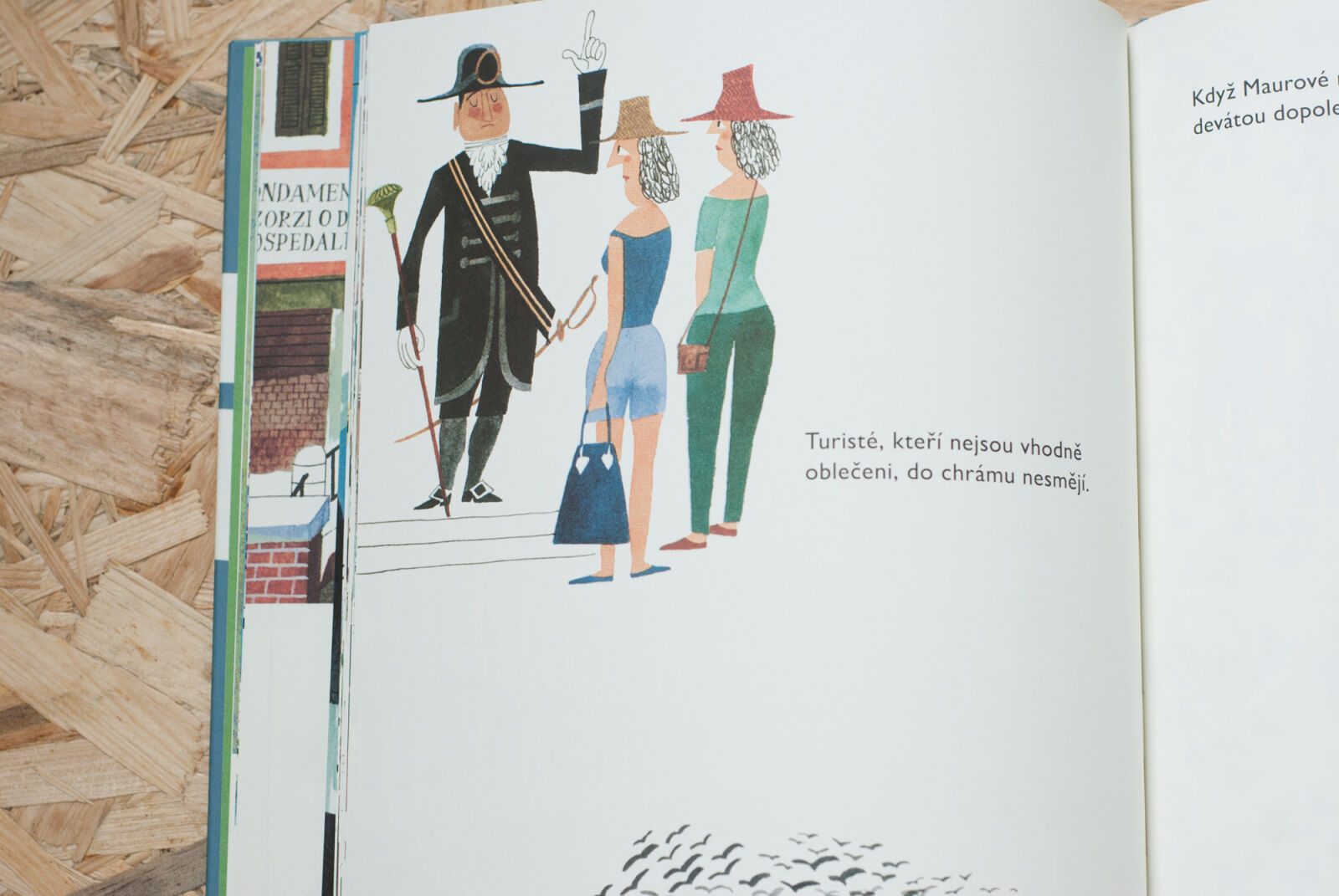 Jako obyčejně je tam takový souhrn všeho, co je zajímavé. Náměstí svatého Marka, holubi a dóžecí palác, prodavači korálů a pohlednic. Tady máš gondoliéry, gondoly se svatebčany a pohřeb na gondole, tady jsou uličky a kanály města, tady je takový typický benátský policista… A tady je bučintoró, to je ta loď, kterou vyjížděli každoročně na moře, aby slavili svatbu Benátek s mořem.